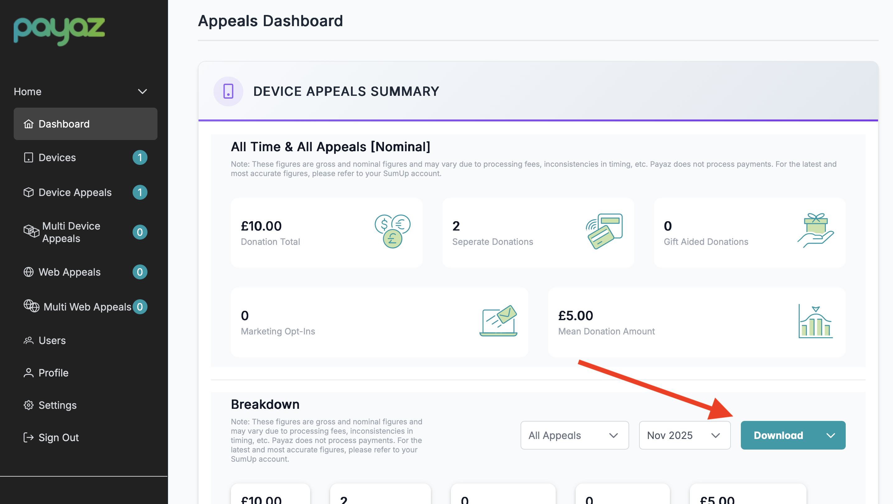 Step 2: On the dashboard click the big blue button labeled "Download" in the break down section of Device appeals Summary or Web Appeals summary depending on what one is applicable. This will then download the file locally on your machine.